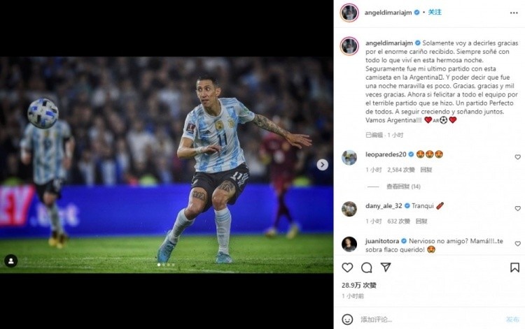 3月28日讯 近日,阿根廷主帅斯卡洛尼在采访中,谈到了迪玛利亚在ins宣布对阵委内瑞拉的比赛是自己在阿根廷国内踢的最后一场国家队比赛这件事。